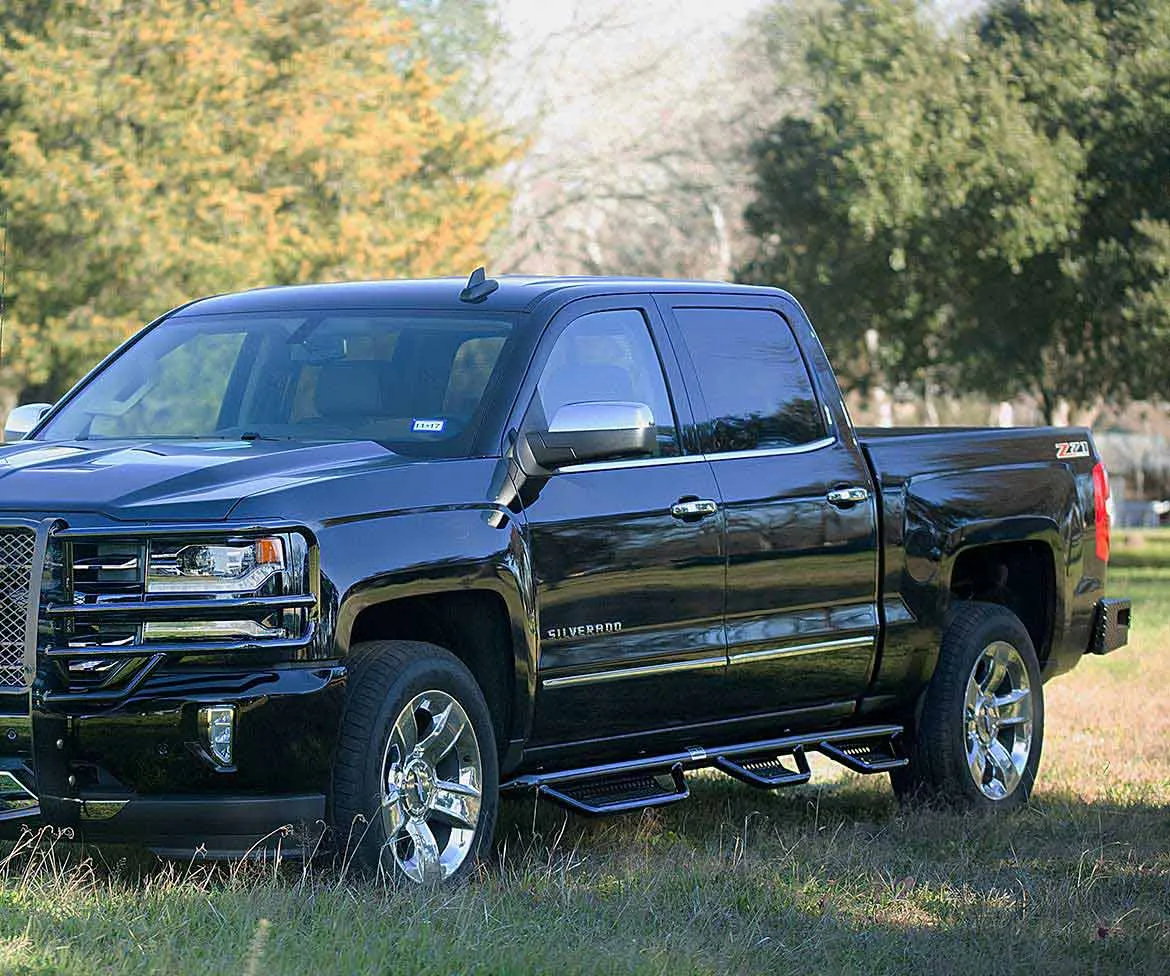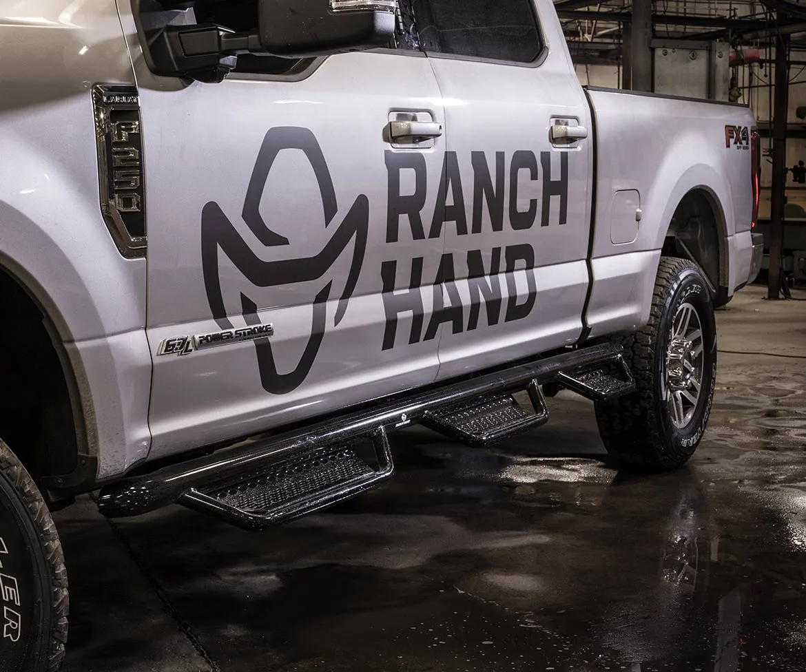 Ranch Hand Running Steps offer the same strength and resilience as Ranch Hand's front and back protection. Offered in 4 steps or 6 steps, our running steps are built from the same high-quality materials as the rest of our products. The unique punched plate pattern on the step, which matches the grille pattern of the truck brand, allows dirt to fall through to avoid mud build-up on the top of the step.